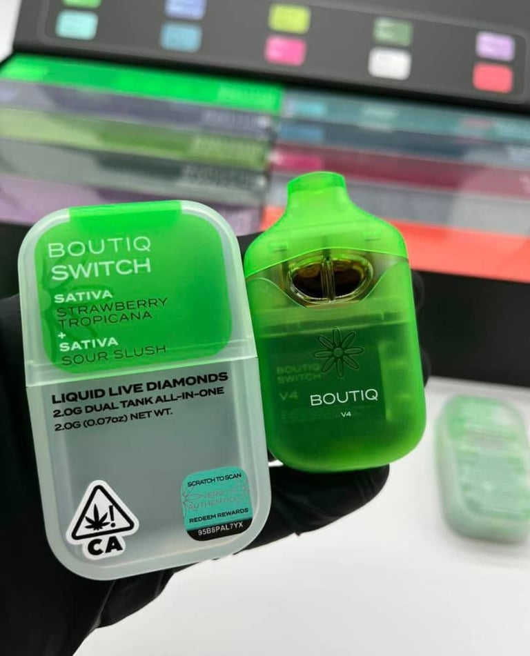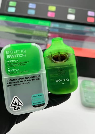 Boutiq is a premium disposable brand known for flavor-first devices across dispensary menus and curated online retailers, with the Switch series positioned as its dual-strain flagship for users who want in-device variety without swapping carts. Across U.S. listings, Boutiq appears with 2g liquid diamond/live resin formulations, strain-specific flavor curation, and rechargeable hardware options that appeal to regular vapers and enthusiasts alike.